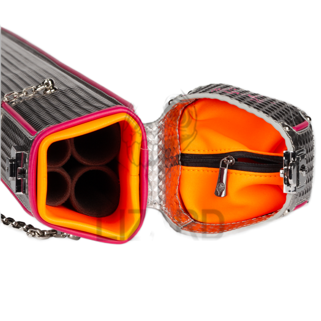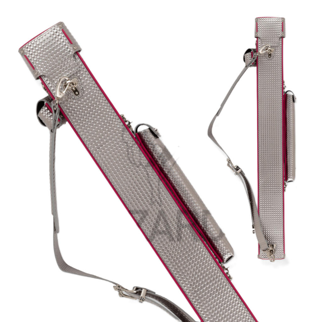 Tags: Lizard LXVTUM, 2x2 cue case, hard cue case, diamond vinyl cue case, silver cue case, pink accent cue case, billiard cue case, pool cue storage, professional cue case