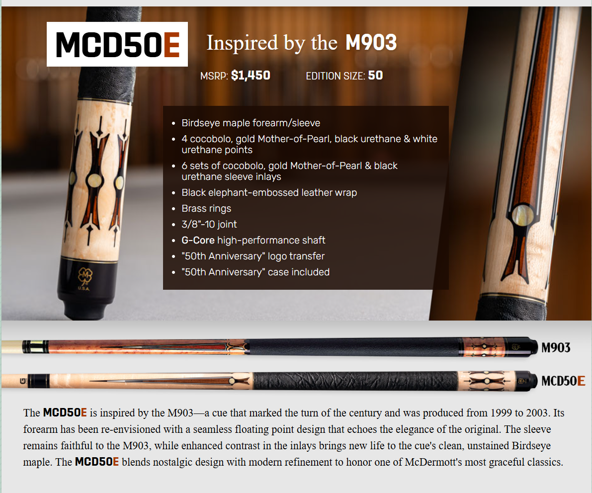 The M903 was one of McDermott's standout designs at the turn of the century, running from 1999 to 2003 and loved for its clean, graceful lines. The MCD50E pays tribute to that cue for the 50th Anniversary, keeping the unstained birdseye maple look while updating the forearm with smooth, seamless floating points.