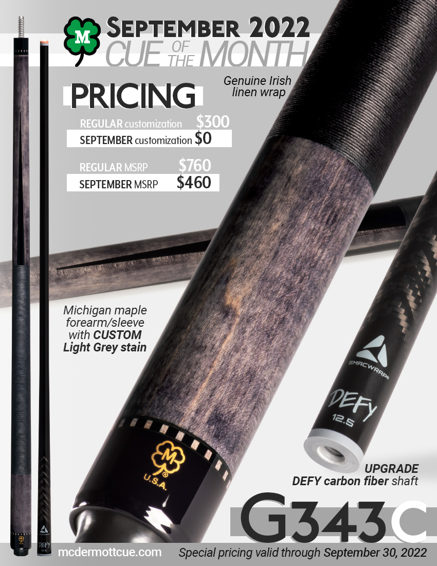 Tags: mcdermott - G343C pool cue, mcdermott, G343C, mcdermott, mcdermott, pool cue, mcdermott, G343, mcdermott, defy shaft, carbon fiber shaft, Sept 2022, cotm, McDermott CUE OF THE MONTH
